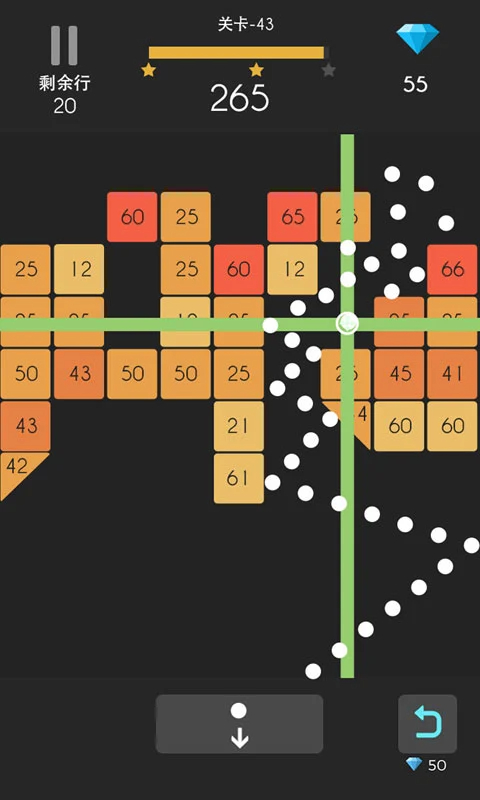 3. 道具组合战术:在BOSS关卡中,先使用“时间延缓”降低方块下落速度,再配合“多向分裂”制造连锁消除效应。例如面对数字20的巨型砖块时,分裂弹可同时减少其4点生命值。