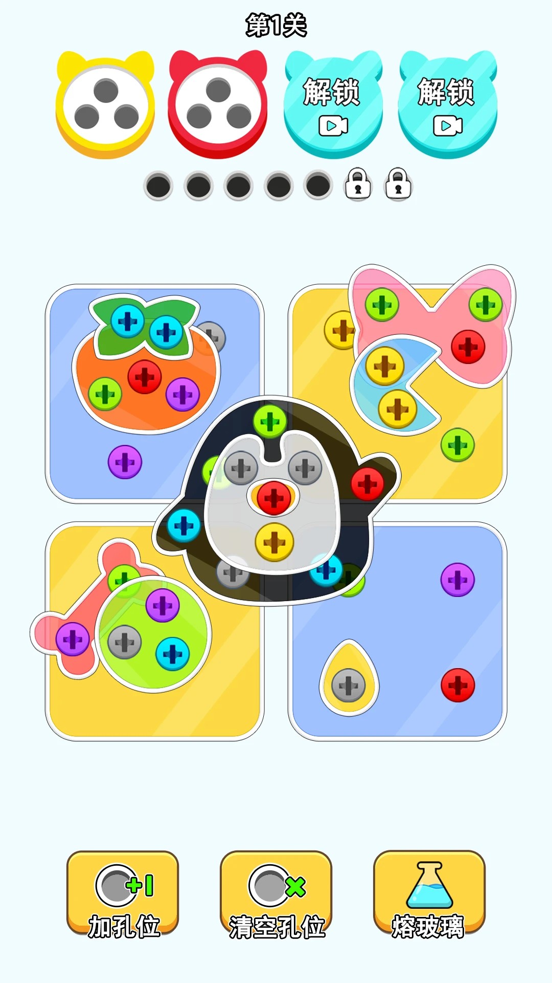 2. 关卡目标解析:每关开始前显示目标提示,如“消除15个蓝色螺丝”或“拼出企鹅图案”。玩家可点击“目标详情”查看具体要求,例如拼图关卡需按顺序消除螺丝才能解锁模块。