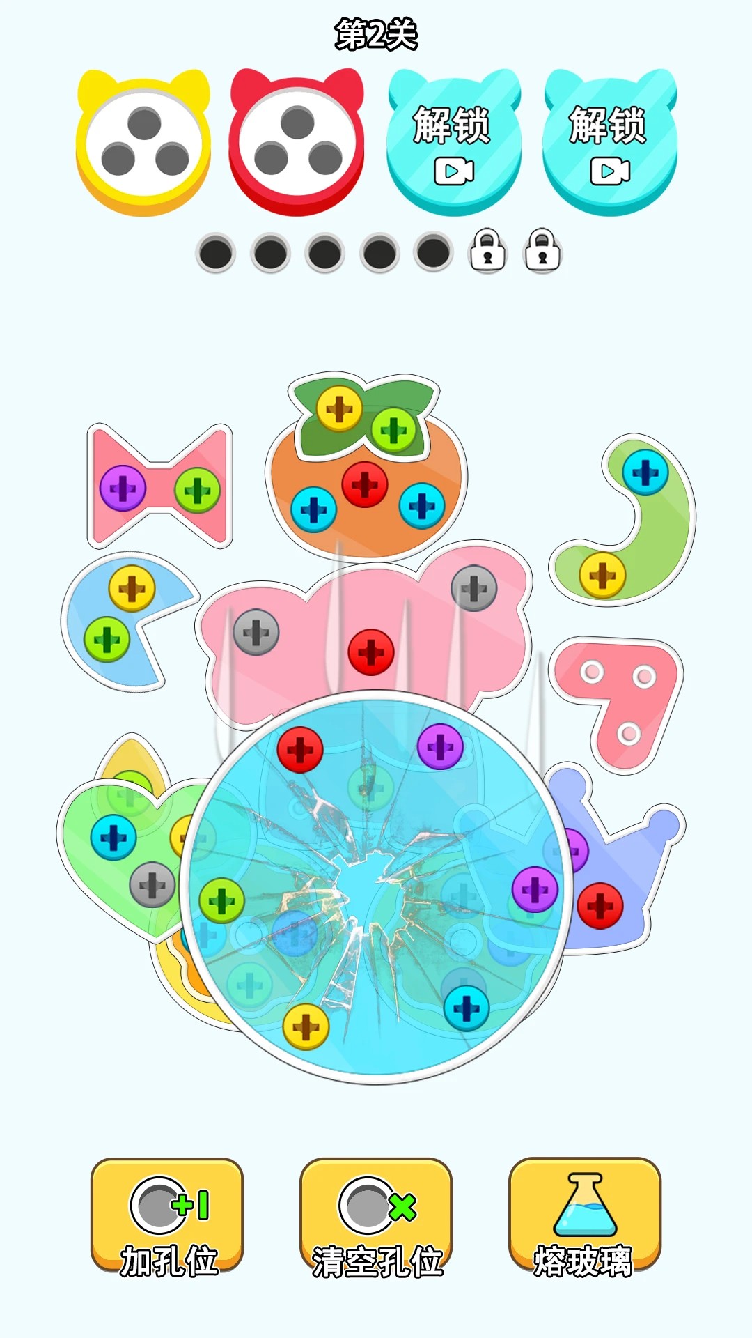 2. 合理利用临时收纳孔位:游戏设有临时收纳孔位,玩家需谨慎放置螺丝,避免孔位填满导致闯关失败。例如,当没有对应颜色盒子时,可将螺丝暂存于孔位,但需提前规划后续消除顺序。