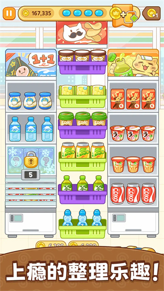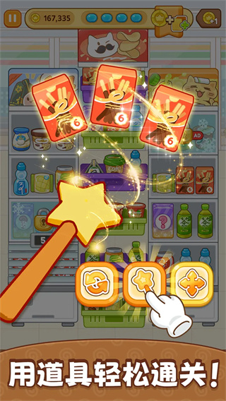 2. 深度策略玩法:关卡设计融合时间限制、障碍物干扰(如冰层、锁链)及多任务目标(如消除特定商品、达到分数阈值),需玩家灵活运用四连消、十字消除等特殊组合生成范围清除道具,后期更可解锁“锤子敲碎单个物品”“刷子清除整行”等魔法道具应对僵局。