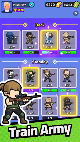2. 高自由度合成系统:战斗中获取的金币可召唤士兵,相同等级士兵拖动合成后升级为更强单位,支持自定义编队与战术组合,例如“盾牌兵+狙击兵”的攻防一体阵型。