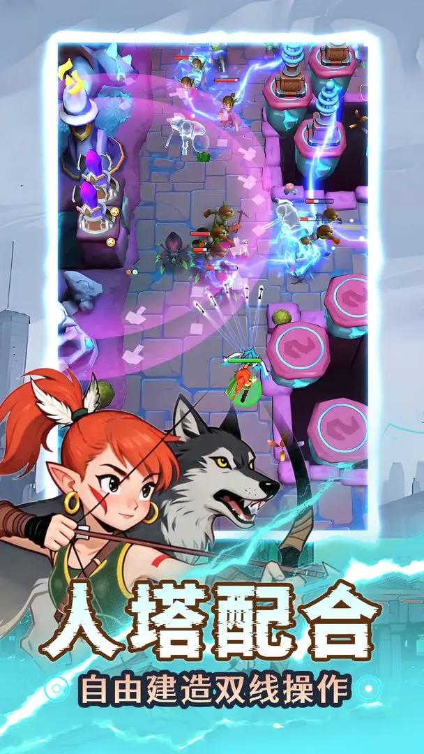 1. 双线操作,攻守一体:左手操控英雄移动射击,右手建造防御塔与陷阱,实现实时双线火力输出。英雄技能可手动释放,防御塔可自由升级升星,形成“英雄牵制+塔防输出”的立体防线。