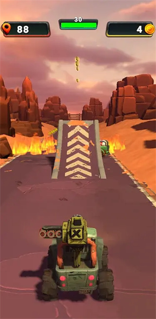2. 利用跳跃躲避陷阱与僵尸群:上滑屏幕触发战车跳跃,可越过深坑、燃烧的油桶或成群的普通僵尸,在沙漠地图中,跳跃还能短暂滞空以躲避沙虫的突袭。