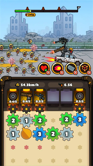 2. 武器改装系统:卡车可搭载6类武器模块,包括机枪、火焰喷射器、电磁炮等。改装时需平衡火力与能耗,例如电磁炮虽能穿透僵尸群,但会大幅消耗卡车动力齿轮的能量。
