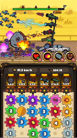 2. 动态环境挑战:泥沼会降低卡车牵引力,雪地导致轮胎打滑,沙漠则因高温影响武器稳定性。玩家需实时调整齿轮组合与驾驶路线,如在雪地关卡中安装防滑链齿轮,或利用沙漠沙丘进行跳跃突围。