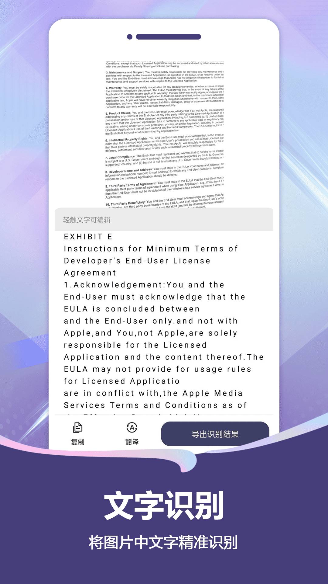 2. 智能OCR文字识别:覆盖中文、英语、日语、法语、德语等12种语言,识别准确率达98%以上,支持印刷体及手写体识别。用户可对识别结果进行二次编辑,导出为Word、TXT格式,或直接翻译为多语言文本,满足国际交流需求。