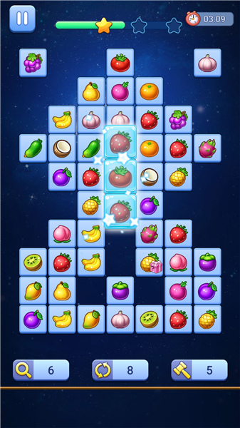 1. 基础消除规则:玩家需在限定时间内,通过点击或滑动屏幕,将两个相同图案的方块用不超过三折的直线连接起来,路径无遮挡即可消除。消除所有方块即可通关,超时或无法配对则失败。