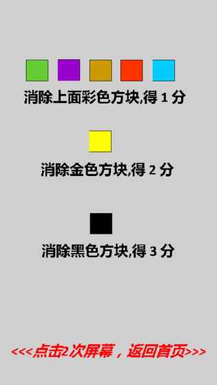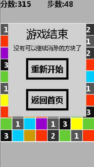 这是一个通过消除障碍保证生存空间,进而通过消除获得更高分数的游戏,当黑块过多而没有可消除的彩块时,游戏结束。