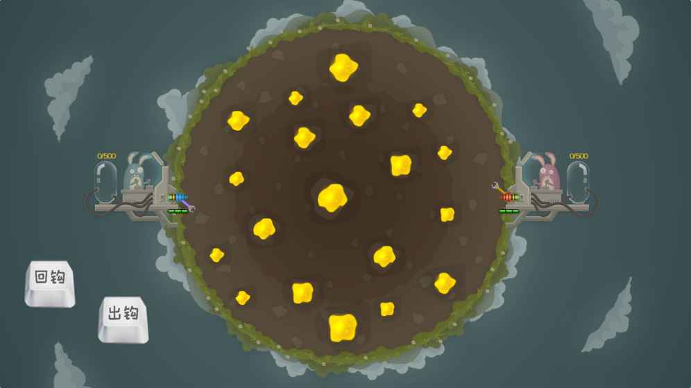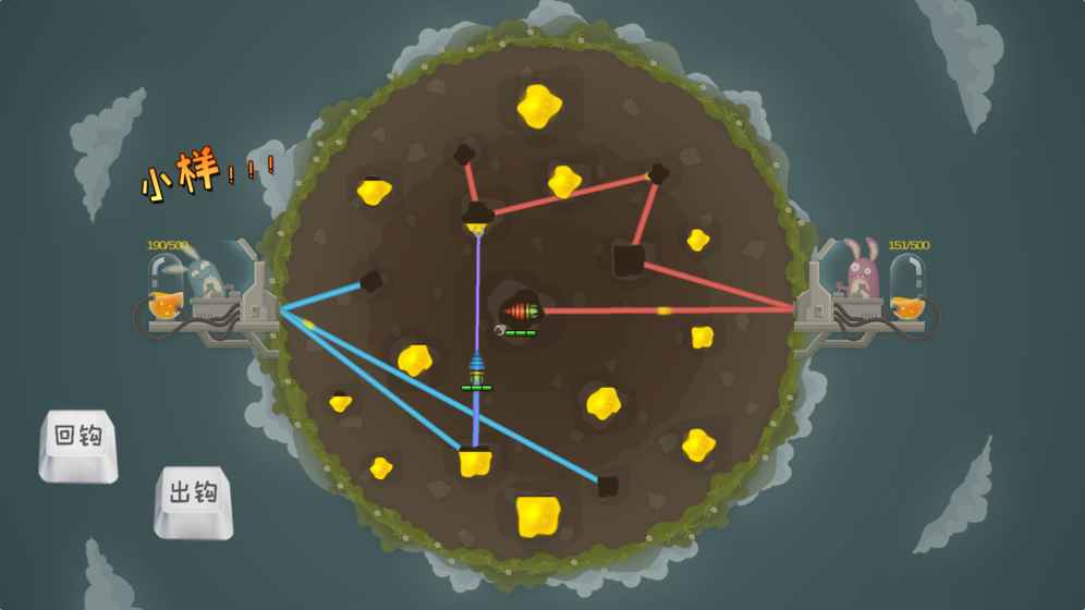 发射你的钩爪射向金块,构建输液线,提取矿液,最先获取500单位液体取得胜利。