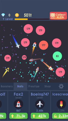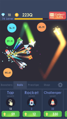 《放置火箭:太空大战》是一款玩法简单的休闲手游,玩家只需点击屏幕即可聚焦并摧毁小球,粉碎各种颜色的弹球就是你的任务和目标,你需要获得更强劲的武器,这样就能获得高分!