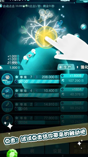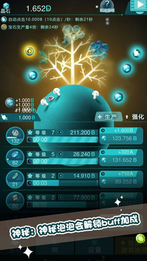 通过点击和收取,在神木之上培育具有神秘力量的宝石,保护并不断培育幸运树。解锁神木的地下世界,发现可爱的小生物,小生物们能够帮助神木自动生产宝石,提升各类宝石生产速率。金色加倍效果可以加速升级神木,让成长变得更容易。