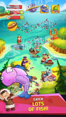 有着大量精彩有趣的内容玩法,在湖面上进行欢乐的捕鱼,然后升级渔船,解锁更多新的捕鱼道具,