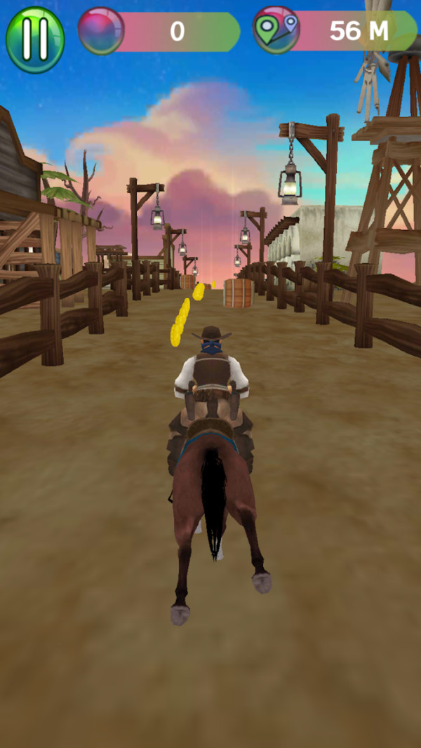 牛仔圈地骑游戏是一款有很强西部风格的跑酷类游戏。玩家在游戏中扮演一个牛仔警长,本身在酒馆里喝酒,突然听见外面有警铃的声音,就骑上自己的马去追赶抢劫了银行的小偷。在追赶的路上,会遇见障碍物,需要玩家躲避,当然路上还会出现金币等道具,玩家需要将它们收集起来。