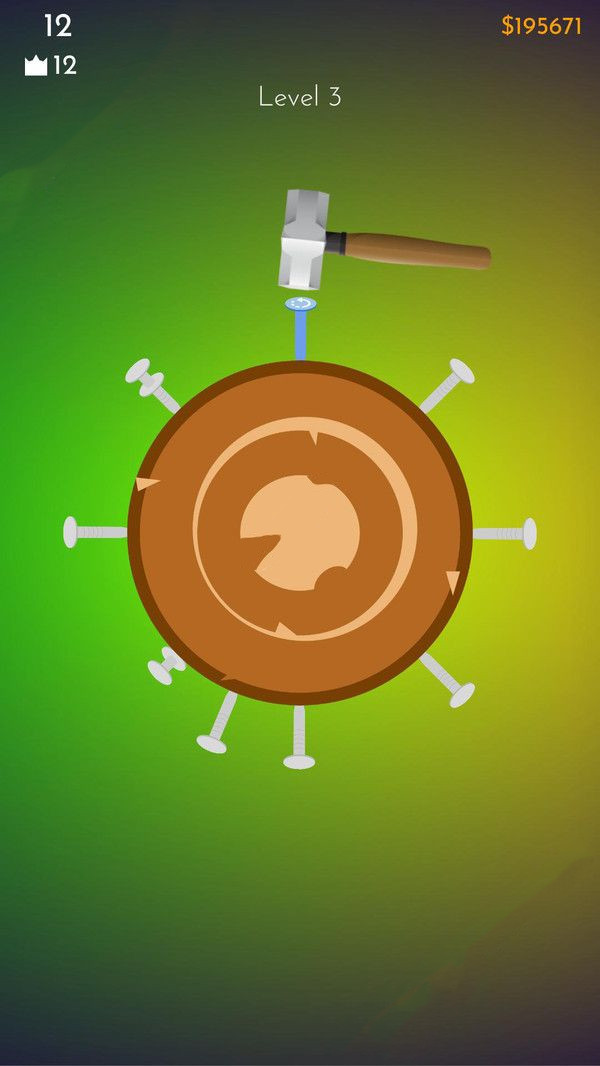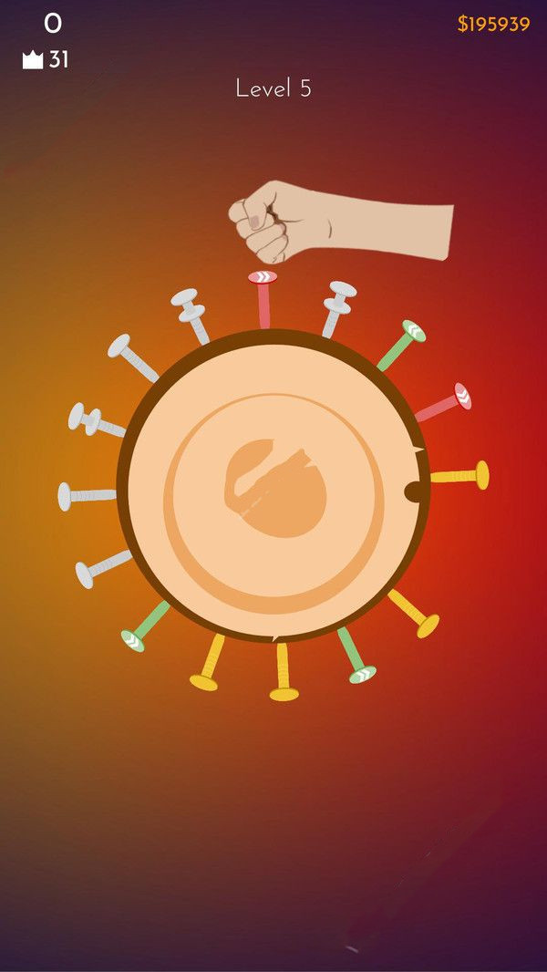 树桩游戏是一款非常魔性的休闲游戏。就是需要玩家在不断转动的树桩上钉钉子,能钉得越多越好,需要玩家观察仔细,考验玩家的手速和眼力,如果两颗钉子钉在了同一个地方,则视为挑战失败。随着通过的关卡越来越多,玩家也会获得更多的金币,可以用这些金币来升级道具,道具不仅仅局限于锤子,还有拳头之类的道具。