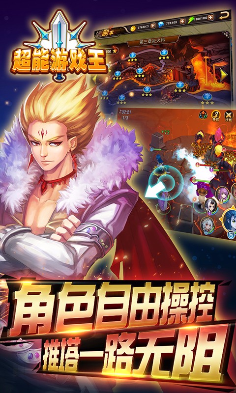 《超能游戏王》的战斗方式组合多变,可虚拟摇杆,也可点触滑动。同时,多角色自由组合,炫操作,炫走位,推塔一路无阻!