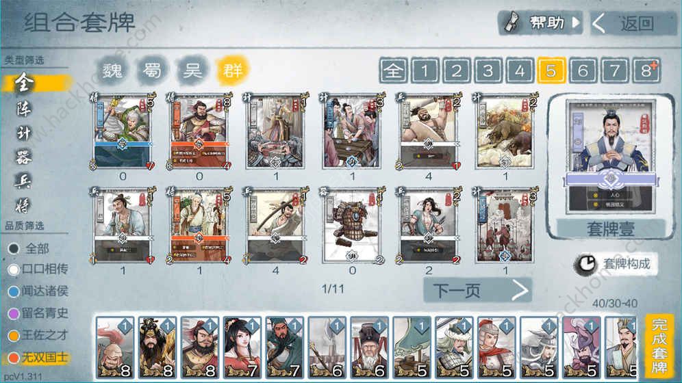2.用你的卡库中已有的属于这个君主的兵(士兵)、将(将领)、计(兵书)、阵(阵法)、器(配备)五种卡牌修筑一套和平用的套牌, 套牌总卡牌的总下限数没有固定,玩家可以依照需求正在30-40张之间浮动。