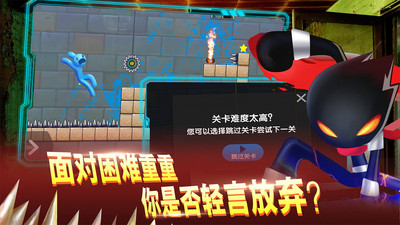 火柴人永不言弃是一款冒险闯关类的手游,多个游戏章节和关卡,通过不断的跳跃和闯关,游戏模式多种多样,还在等什么,赶快下载吧!