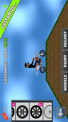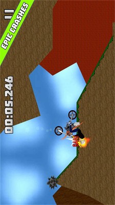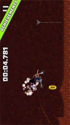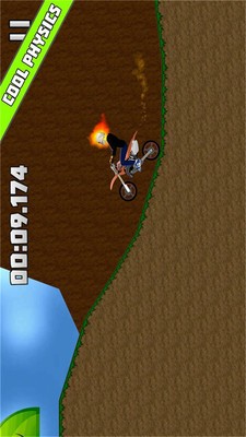 这是一款简单的物理类的小游戏,游戏中,你将化身为一个摩托车手,在各种复杂危险的地形上开摩托车。你的目的是从起点到终点,顺带着收集途中的各种道具,比如那个红色的果子。游戏有多种控制方式,一开始进去,会让你选择具体的控制方式,你可以选择触摸屏或者轨迹球控制。游戏的操作很简单,在触摸屏下通过屏幕左右的方向键进行控制,那个循环的图标是转向的按钮。
