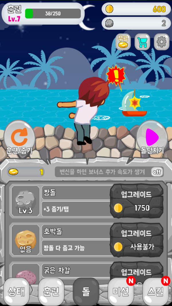 石头弹跳是一款简单的休闲类手游,游戏中你控制主角进行打水漂的活动,控制好角度和力度将石子抛出,让石子能够飞更加远的距离。比较超现实的是你可以升级你的石头,越升级就能够打越远的水漂,十分魔性,根本停不下来。