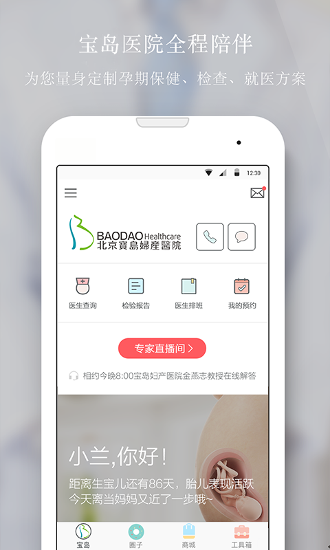 北京宝岛妇产医院app是一款健康医疗应用,是北京宝岛妇产医院的手机客户端。通过北京宝岛妇产医院app你可查阅专业的健康信息,计算预产期,以及观看医疗大咖直播视频等。