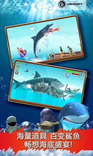 完成50个任务,寻找宝藏获得金币和宝石,升级你的鲨鱼或购买特殊的救生物品。逐渐解锁更多水下凶猛的动物:灰鲨、锤头鲨、虎鲨和无敌大白鲨!