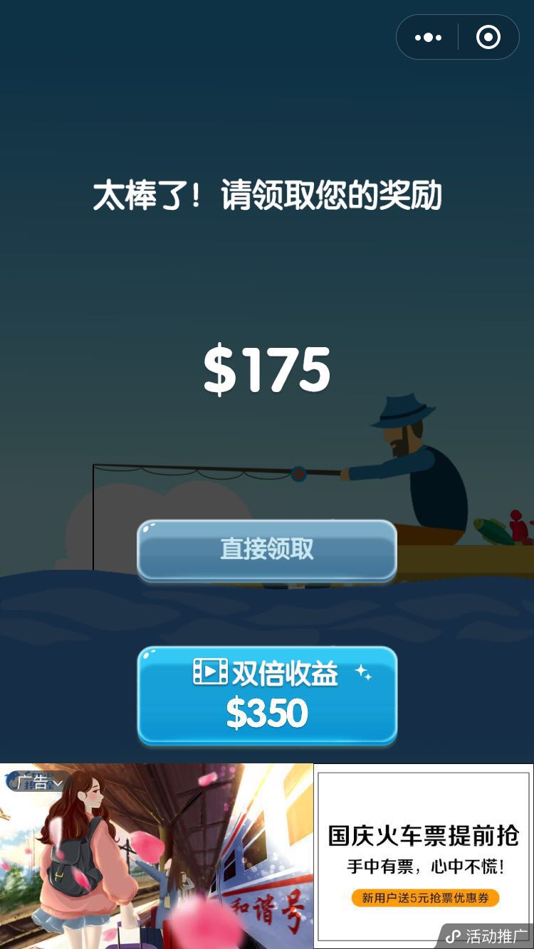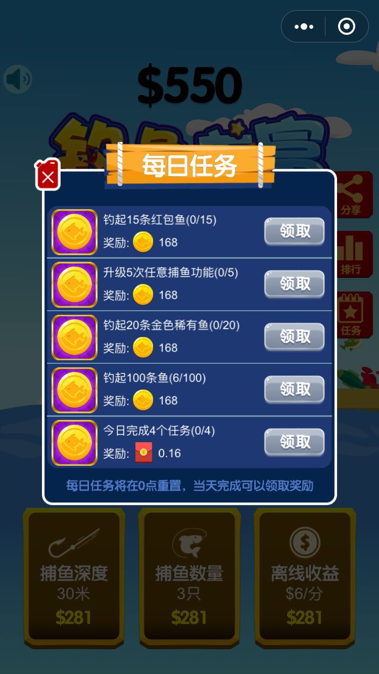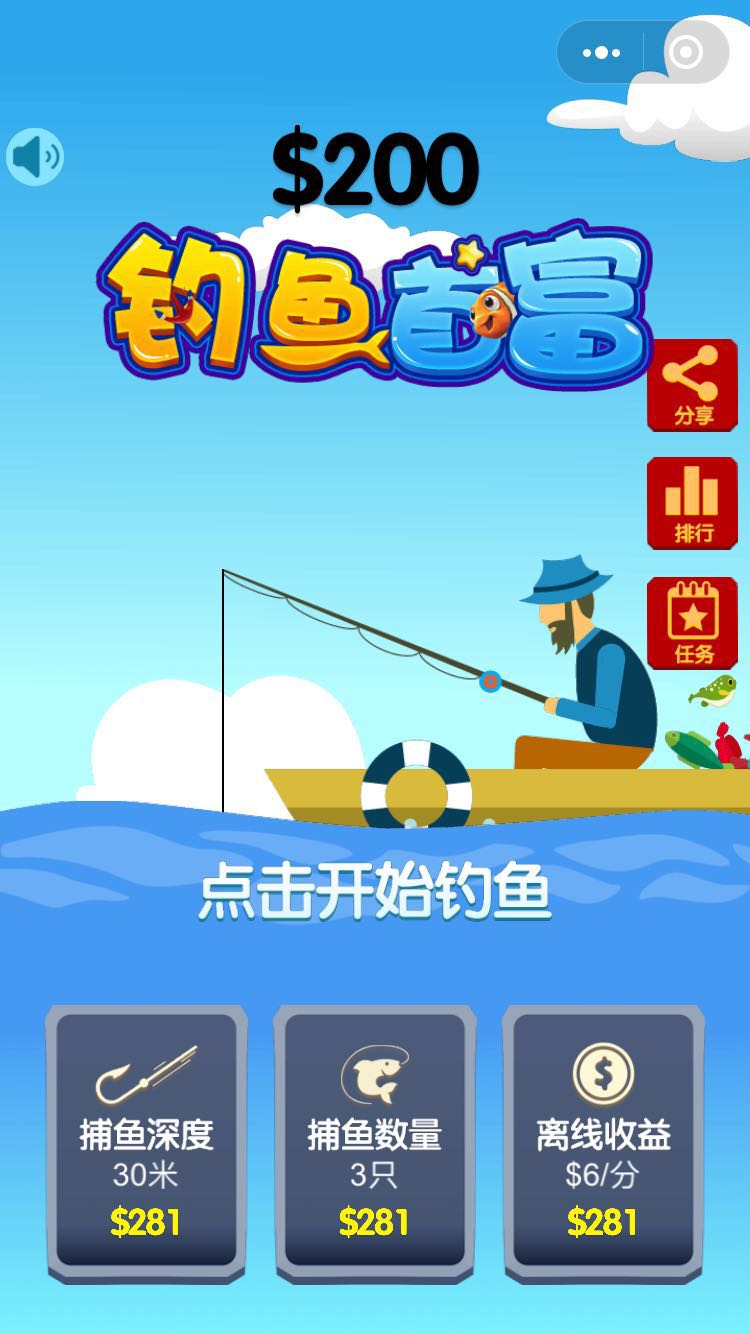 2、你要升级自己的鱼竿等级,才能捕获更多的虾兵蟹将哟,同时你可以把这个游戏分享给好友你就可以获得更多的金币