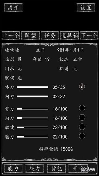 本游戏是一部全自由模式单机RPG游戏,游戏内所有剧情完全由玩家自由选择,整个游戏无任何限制,整个世界走向完全由玩家自己定义。玩家扮演一个初入江湖的侠客,游走在各大门派之间,通过接各种委托任务赚钱,同时不断提高自己的武学修为和江湖声望,组建自己的队伍。
