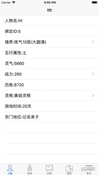 境界:炼体、炼气、筑基、开光、融合、心动、金丹、元婴、出窍、分神、合体、洞虚、大乘、渡劫