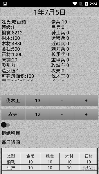1、文字游戏,模拟了一方领地的运营,粮食、木材等物资数据化,农夫和伐木工的分配等等;