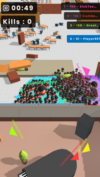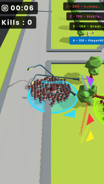 开局每个人都是带着一个粉丝,地图中有不同的地形,玩家开始不要和其他的粉丝群体打架,去吞噬哪些不动的中立粉丝,吞噬后即可壮大自己的粉丝群体,可以看到这些粉丝跟着你到处跑,十分有趣。