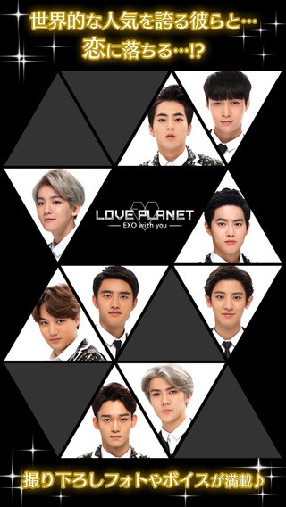 Allfuz和cybird双平台上架一款有人气偶像EXO为主题的恋爱模拟游戏《爱行星~EXO与你~》,本作用的画像都是从本人直接摄影的画像,写实恋爱模拟游戏,另外玩家还可以自定义服装,另外还有只能在游戏中听到他们的专享语音。