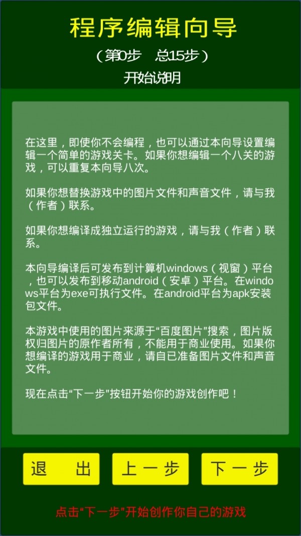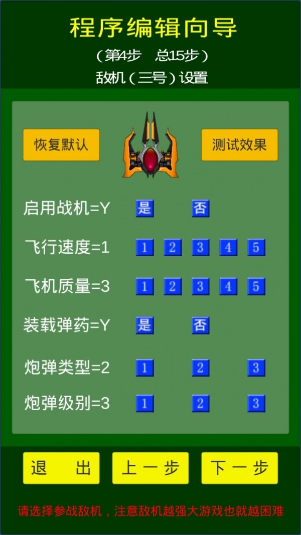 当前版本1.0。本软件分为两个部分:“编辑游戏”为软件的核心部分,用于创作平面射击游戏;“开始游戏”和“自由选关”为本软件创作的游戏示例。