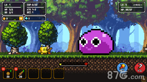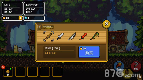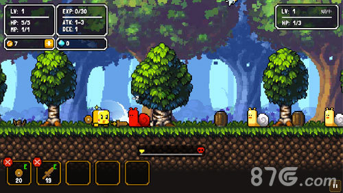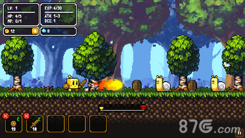 每次开始关卡时,角色都会从头开始(等级保留)初始玩家会带有木剑、木盾和一小桶泡面。好好利用这些道具是初期的生存之道。打倒怪物会掉落金币和经验,积累经验等级会提升,主角的各项属性也会提升。