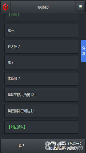 地心引力是一款由蝶梦游戏开发的文字类冒险手游,游戏的背景设置在太空中,面对错综复杂且严苛的生存环境,主角该如何生存下去呢?你不仅要面临本身的生存危机,还要应对外星人入侵。玩家将通过文字推进游戏的进程,快来打开你的脑洞解决问题吧。你可以帮助主角选择是冒险从有绿色怪物的小路走还是从塔边绕,可以帮他选择从左走还是从右走,也可以选择顺时针寻找按键还是逆时针。
