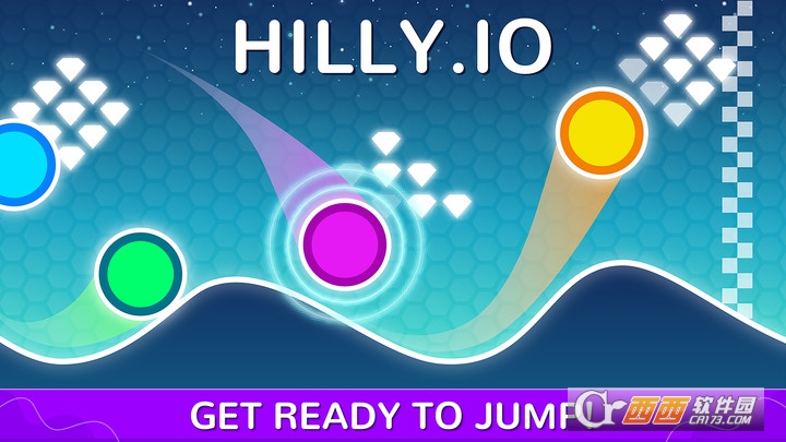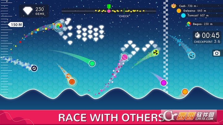 在场景画面中,我们可以看到有许多小球正在山丘地形的道路上飞速前进,玩家需要控制自己的专属小球不断的超越前面的球球对手,让自己的小球始终滚动在最前进,那么玩家的小球就会是这次球球丘陵竞速的第一名。