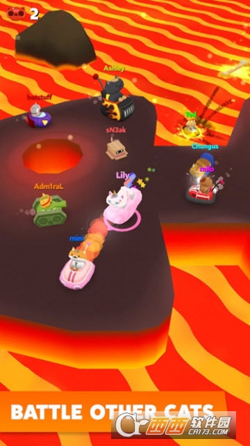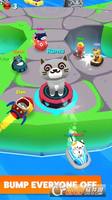 有各种猫咪进行比赛对战,玩法和碰碰车一样,和其他的玩家对撞,将其玩家撞到海里面去。玩家只要不断地去碰撞,把其他的猫咪碰撞下去,拖动即移动。如果自己掉到河里、岩浆里的话,游戏即为结束。多种地图绚丽多彩,把其他玩家赶走,变大,当然也要小心不要被被别人撞下去,成为地图上最后一只获胜的猫。使用简单的一个手指控制在短动作密集的比赛中驾驶和撞到其他玩家。每只猫都有独特的骑行方式:汽车、斗杆、滑板、飞碟、坦克……你说出它的名字。