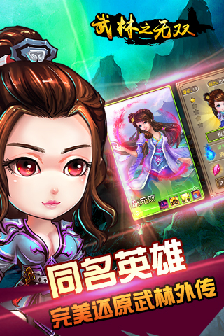 武林之无双是一款以电视剧《武林外传》为题材改编的Q萌动作卡牌手机游戏。手游为玩家完美重现影视剧中的人物角色,技能组合霸气炫目,更有技能打断玩法,尽享战斗酷爽根本停不下来!《武林之无双》拥有超高策略可玩性,同福客栈、精英副本等你来战,《武林外传》是忠实粉丝们,举起你们的双手,动动手指下载吧!客栈终极对决,谁是武林第一人,来开创你的专属无双江湖!