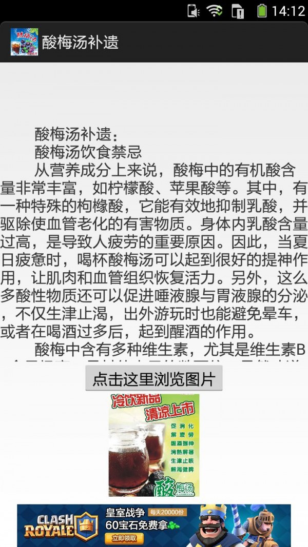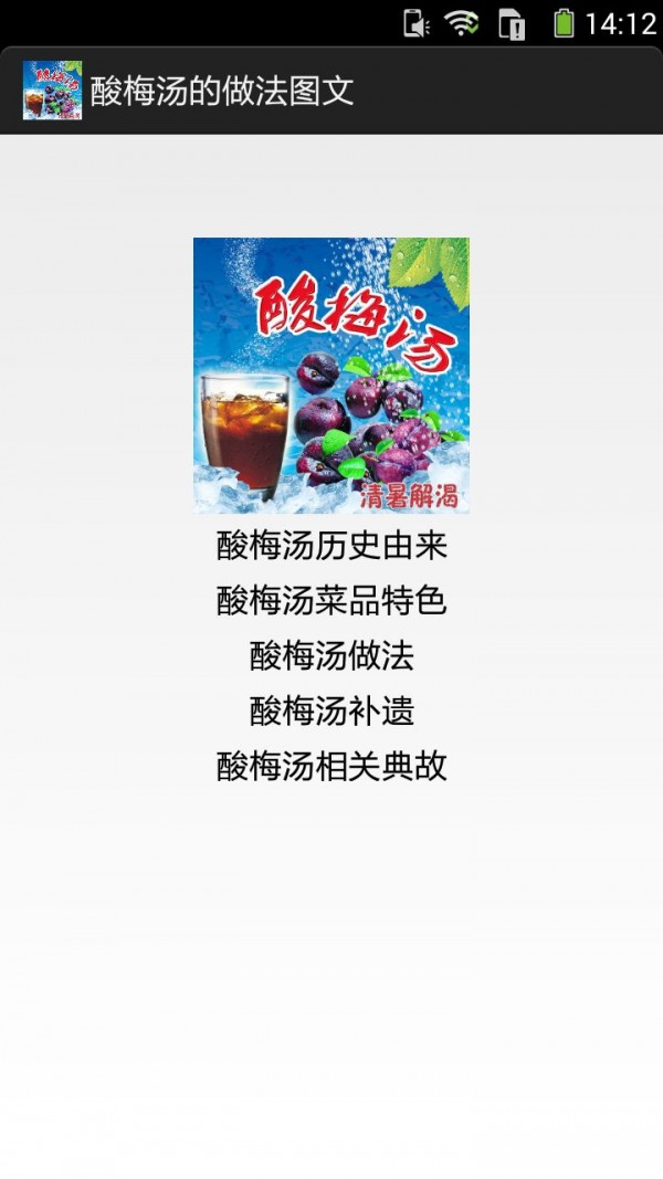 《酸梅汤的做法图文》APP手机应用内容介绍:你可以通过手机应用查阅酸梅汤历史由来、酸梅汤菜品特色、酸梅汤做法、酸梅汤补遗、酸梅汤相关典故。酸梅汤菜品特色:该汤消食合中,行气散淤,生津止渴,收敛肺气,除烦安神,常饮确可祛病除疾,保健强身,是炎热夏季不可多得的保健饮品......