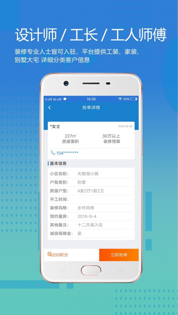 app是一个提供业主装修需求的装修接单软件,可选择入驻的装修公司、设计师、工长、工人师傅及主材商户等类型的装修服务商均可,工人在app按照客户需求和规则注册认证后接单,在获得业主需求信息后,及时与业主沟通病提供装修相关服务。