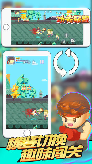 功夫联盟游戏是2018年清新搞怪的街机格斗游戏,游戏横版和竖版自由切换的特色,大量可爱搞怪的角色选择,畅快淋漓的单手操作玩法,让玩家不断挑战boss,击败boss取得胜利。
