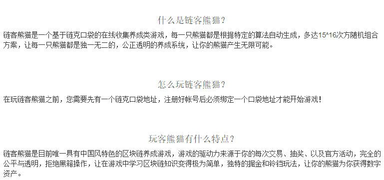 链客熊猫是一个基于链克口袋的在线收集养成类游戏,每一只熊猫都是根据特定的算法自动生成,多达15^16次方随机组合方案,让每一只熊猫都是独一无二的,公正透明的养成系统,让你的熊猫产生无限可能。
