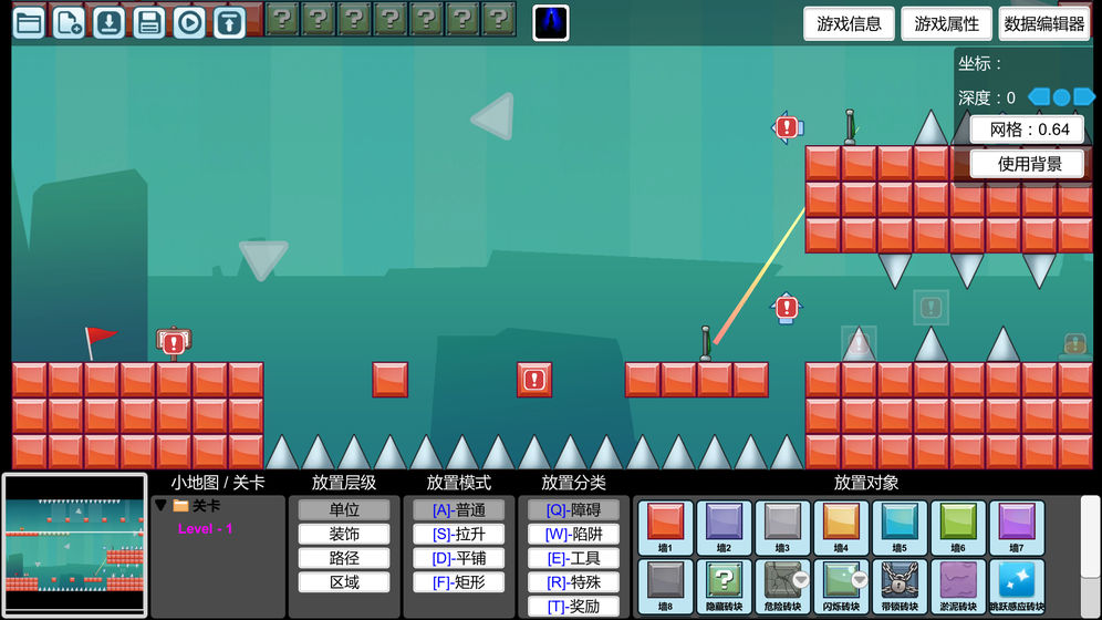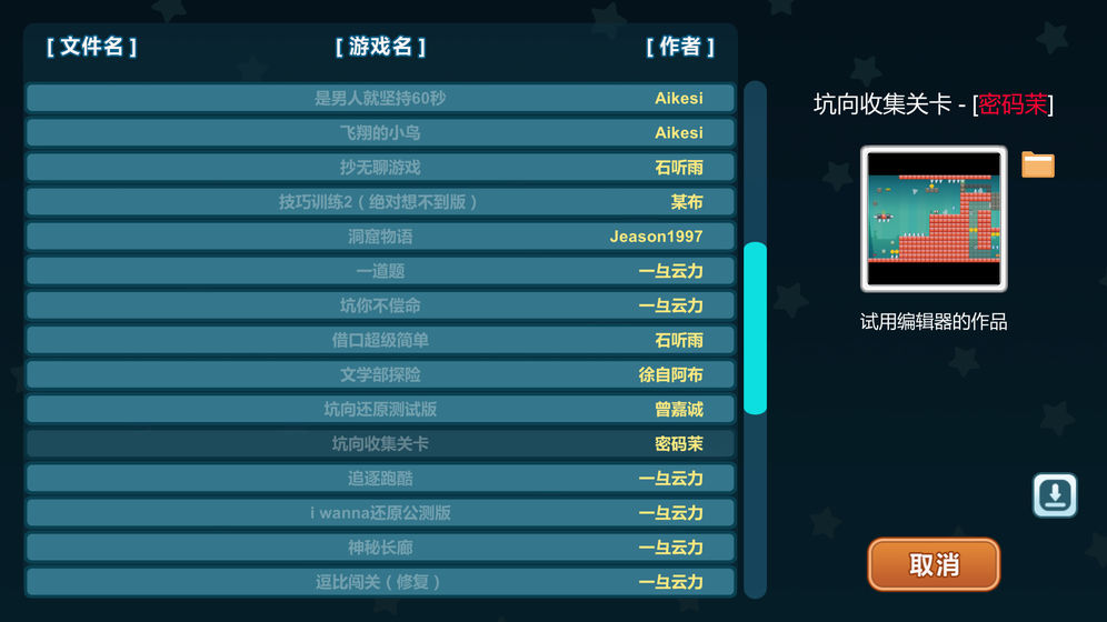 平台跳跃类游戏,参考了i wanna。内置了独立的关卡编辑器,可以自己创作以及分享关卡。