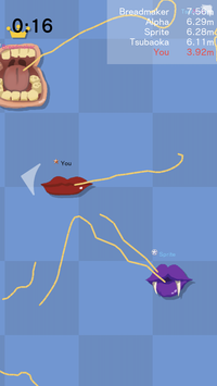 玩家需要在游戏中控制自己的嘴巴,不断地吃面条来增强自己,消灭其余的势力,在有限的时间内,只有生存到最后的胜利。
