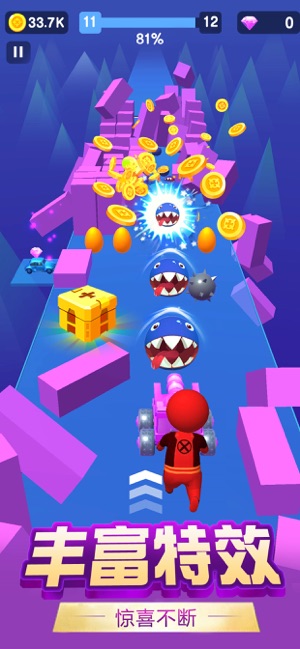 2、不断地通过越来越难的关卡,解锁新的关卡与皮肤。