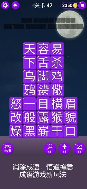 消消成语游戏是款好玩的休闲益智手游,奇特的游戏背景画面,配上成语文字这个游戏不简单,3000多个成语等你来战,挑战不过别垂头丧气哦,来游戏下载体验!