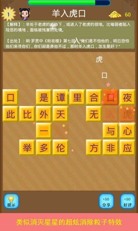 成语消消乐是一款非常具有挑战性的益智类答题游戏,我们加入了大量动画和趣味元素,使得游戏生动耐玩。100关逐步增加难度的关卡,等你来赏玩和挑战。