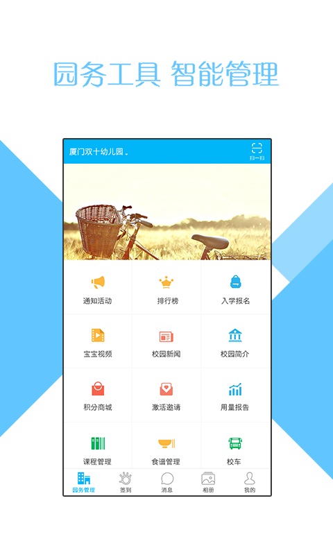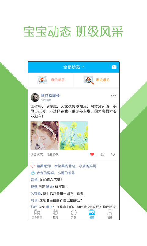 校园动态:园丁随时随地了解园所新闻动态、通知发布、活动报名均可掌控手中!视频监控:实时查看园所情况,让园长的管理更省心!家长留言:一对一模式让园丁、园所方便回复家长咨询,稳妥处理家长投诉。儿歌学堂、育儿知识、故事大全:丰富而有趣的教学辅助资料,也是园长、幼师们最好的助力工具。