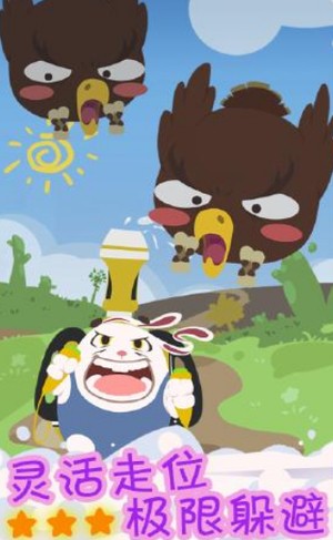 2、玩法简单老少皆宜,在控制兔子躲避老鹰攻击的同时寻找空挡去攻击老鹰,击败老鹰即可通关。