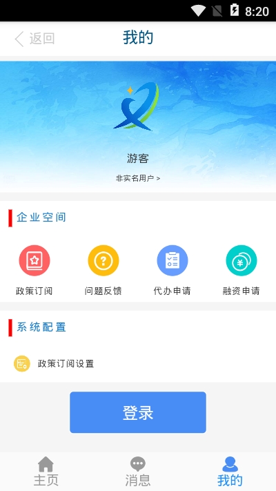 首页内容展示了政策通、项目通、银企通、资讯通、技术通、服务通、政策播报每日一听和服务公益包的入口,在APP底部有政策、政策订阅、项目日历的、我的(个人中心)的入口。