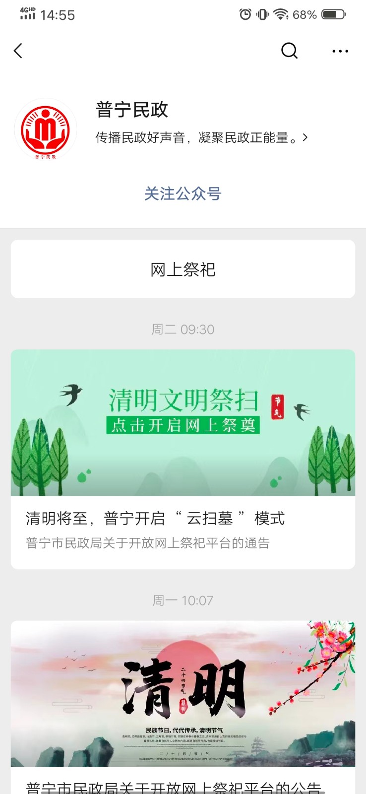 2、点击菜单“网上祭祀”进入页面; (可扫描以下二维码进入公众号)